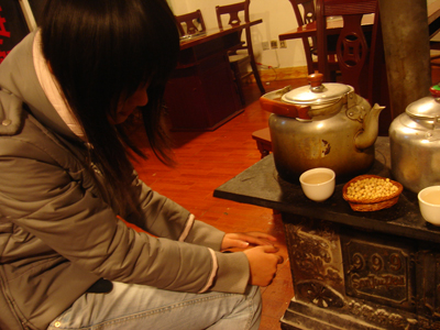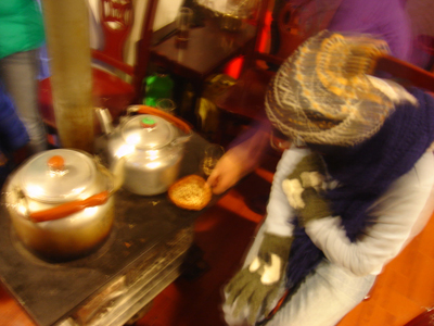 晚上吃飯的地方, 這是當地人的烤爐, 是用來烤人的, 爐上還有水, 那麼供應給客人的就永遠是熱水了(熱水是奢侈品...)。